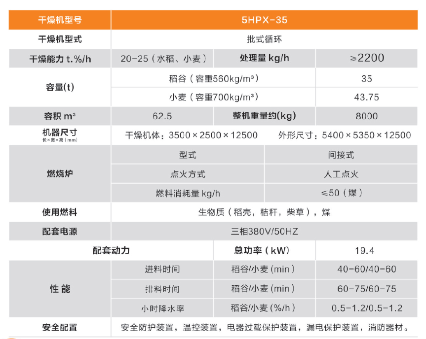 5HPX-35型低温批式循环谷物干燥机,采用多功能式一体机设计,间接热风加热,超大的容量,增大了烘干层面积。因巧妙的结构设计,减小了所需动力,在给用户节省占地面积和节省能源的基础上提高了烘干效率。5HPX-35型低温批式循环谷物干燥机适用于小麦、稻谷、玉米、瓜子、棉籽和豆类种子等谷物的干燥。